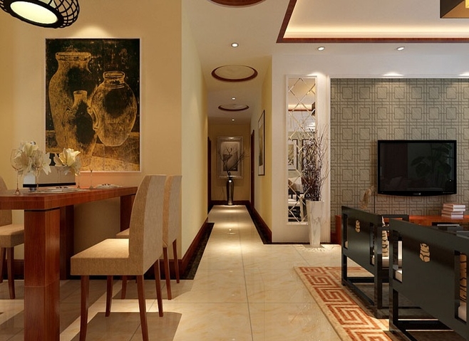 本案白色混油“回”字型的沙發(fā)背景,體現(xiàn)出新中式的“新”加以“回”字型的地毯和網(wǎng)面的無紡布電視背景墻,處處突顯和諧融洽的生活氛圍。